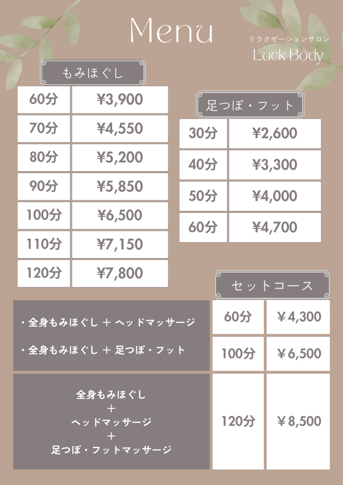 リラクゼーションを目的とした施術を行っております。医療行為、それに準ずる施術は行っておりませんのでご了承ください。